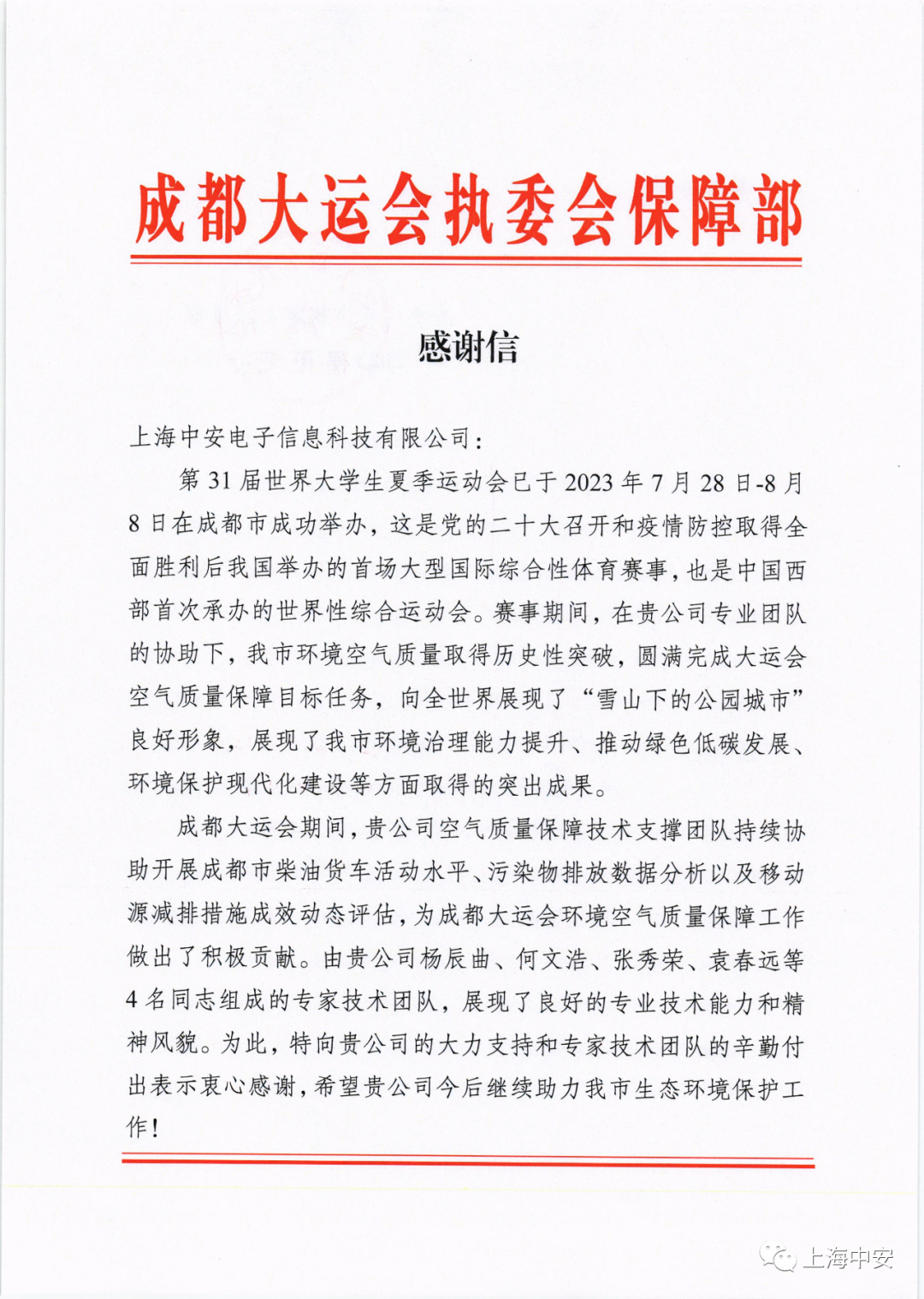 成都大運(yùn)會(huì)執(zhí)委會(huì)保障部發(fā)來(lái)一封感謝信?。?023-10-15)
